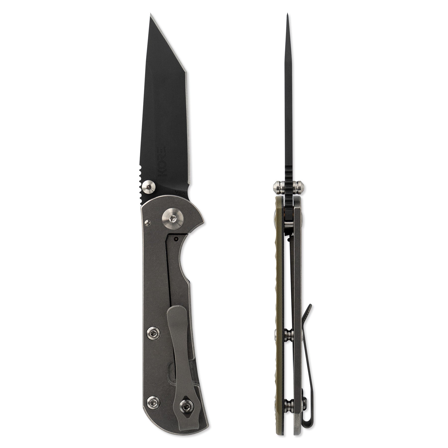 The Chasm rides on phosphor bronze washers for a smooth, controlled action, and the handles, hardware, and deep carry pocket clip on this midsize knife are all constructed from 6AL-4V titanium to ensure longevity and toughness. All colored handle options are finished with KG Gunkote, which provides excellent abrasion, chemical and impact resistance.